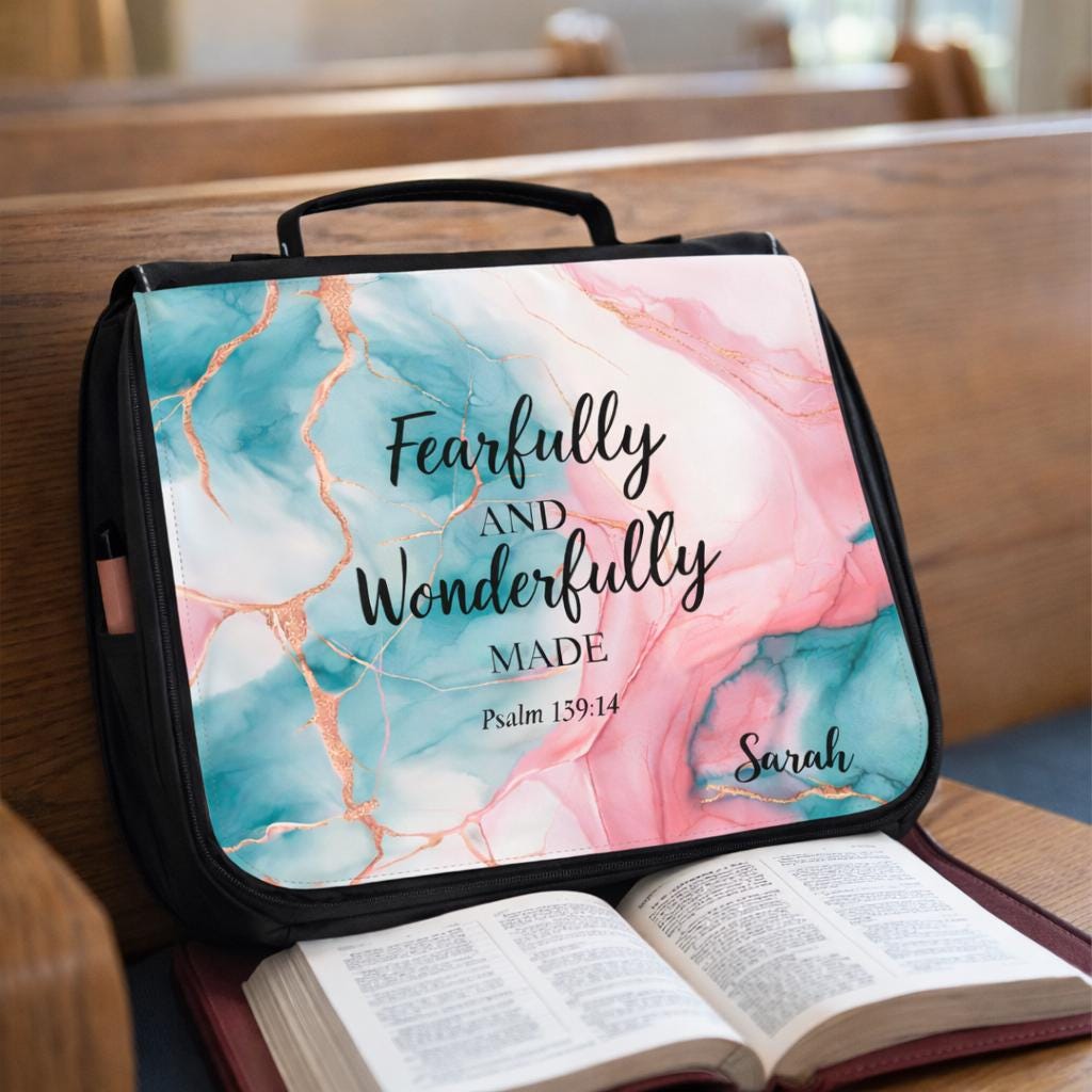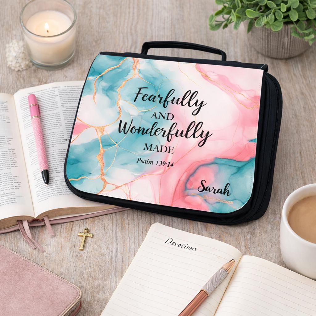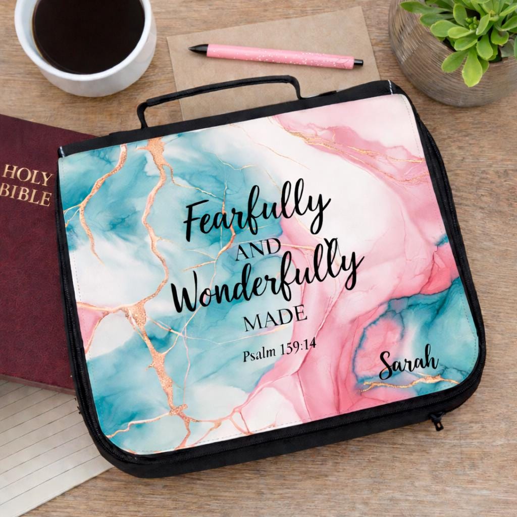 Carry your Bible with beauty, purpose, and organization. This personalized Bible cover tote features the inspiring scripture “Fearfully and Wonderfully Made” from Psalm 139:14, making it a meaningful Christian gift for women of faith.