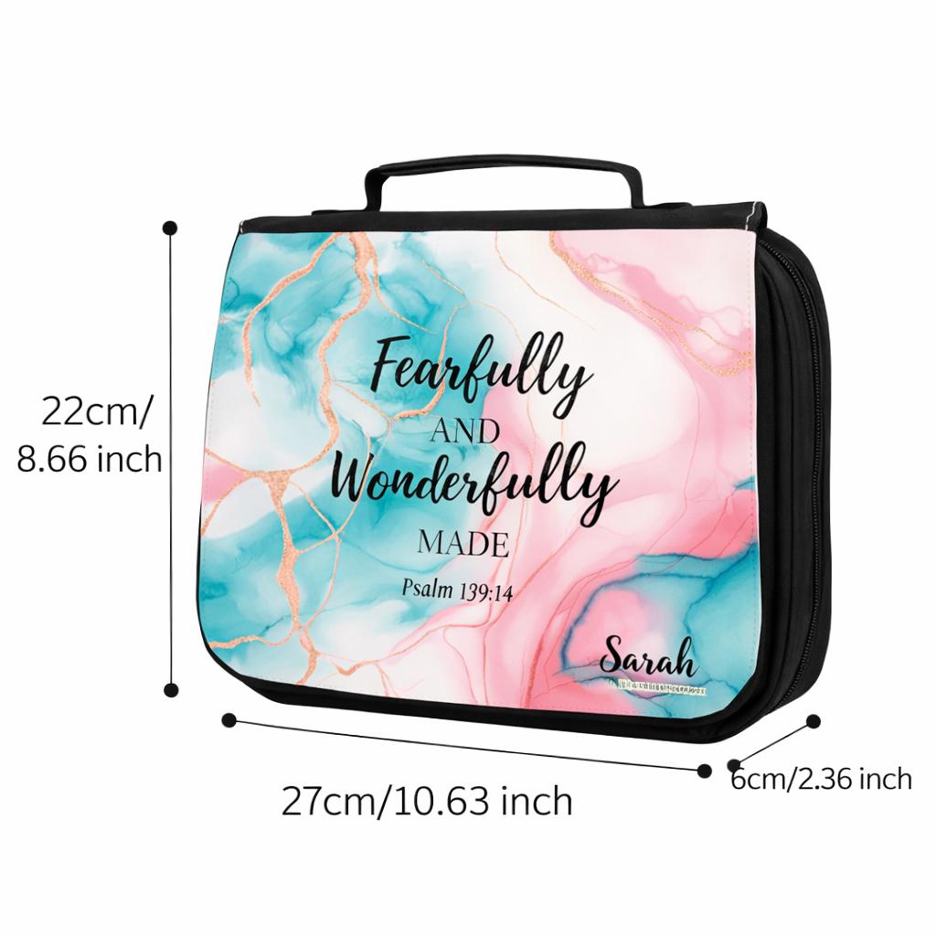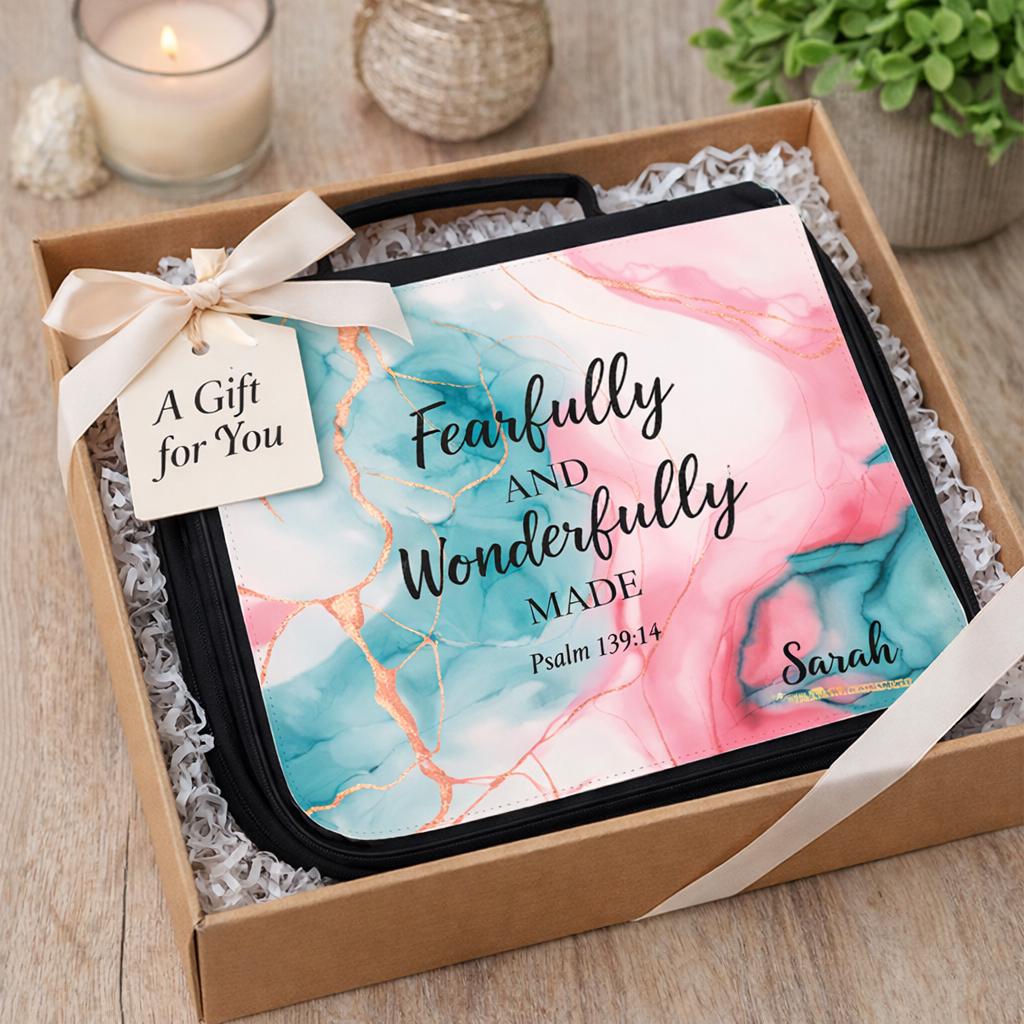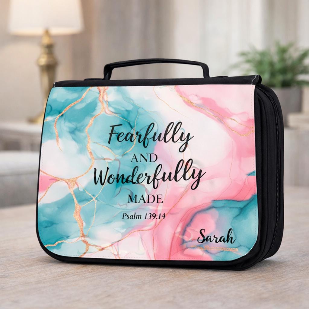 Carry your Bible with beauty, purpose, and organization. This personalized Bible cover tote features the inspiring scripture “Fearfully and Wonderfully Made” from Psalm 139:14, making it a meaningful Christian gift for women of faith.