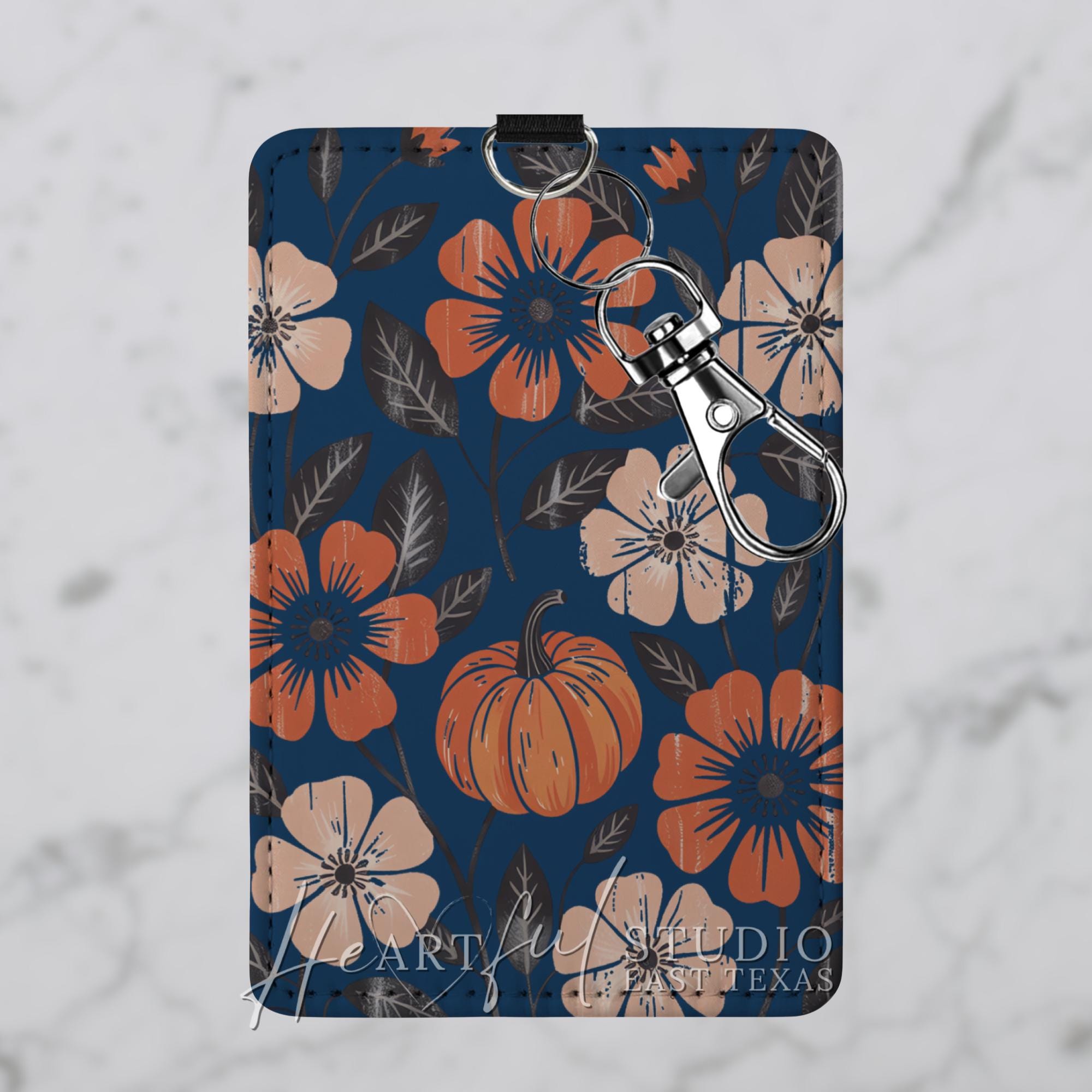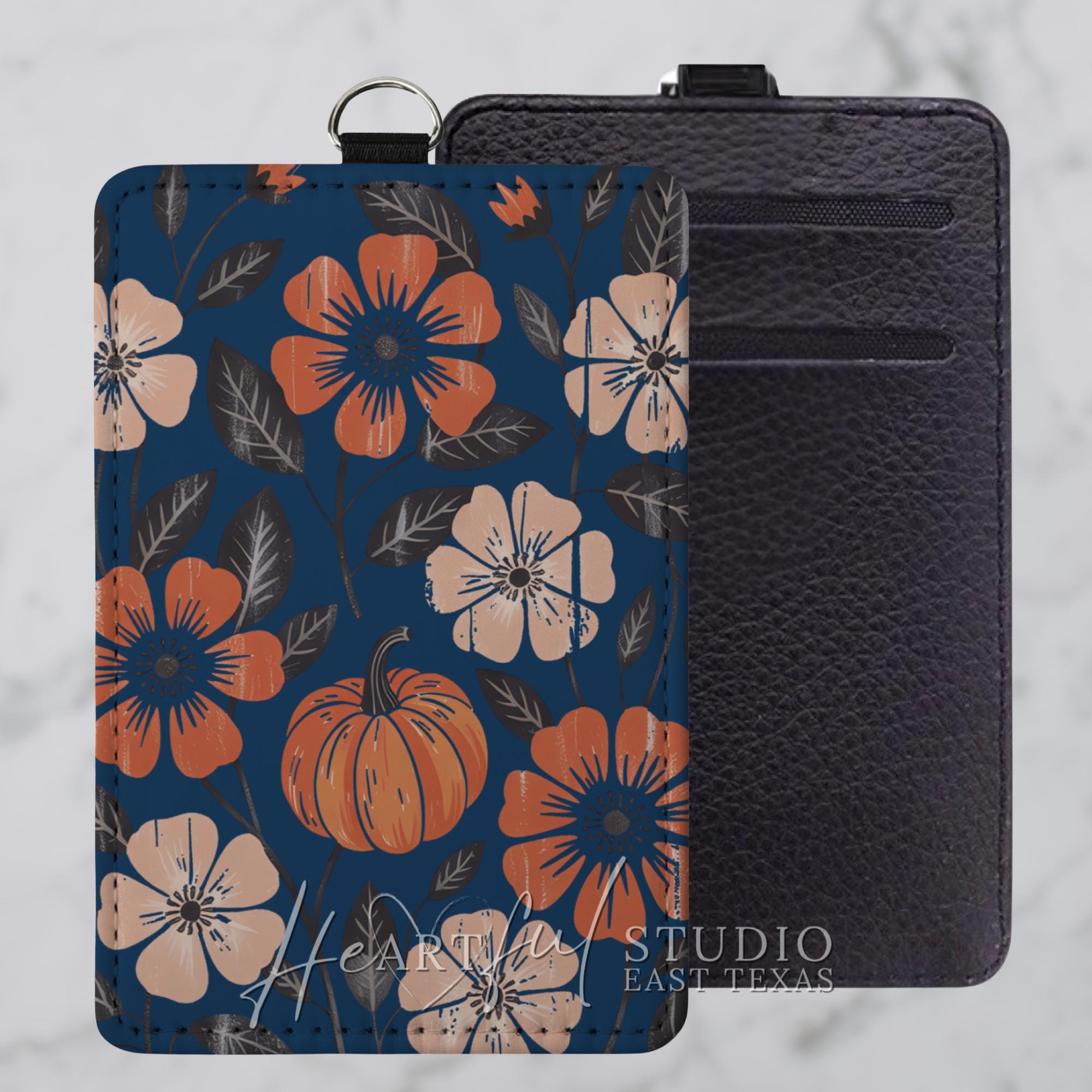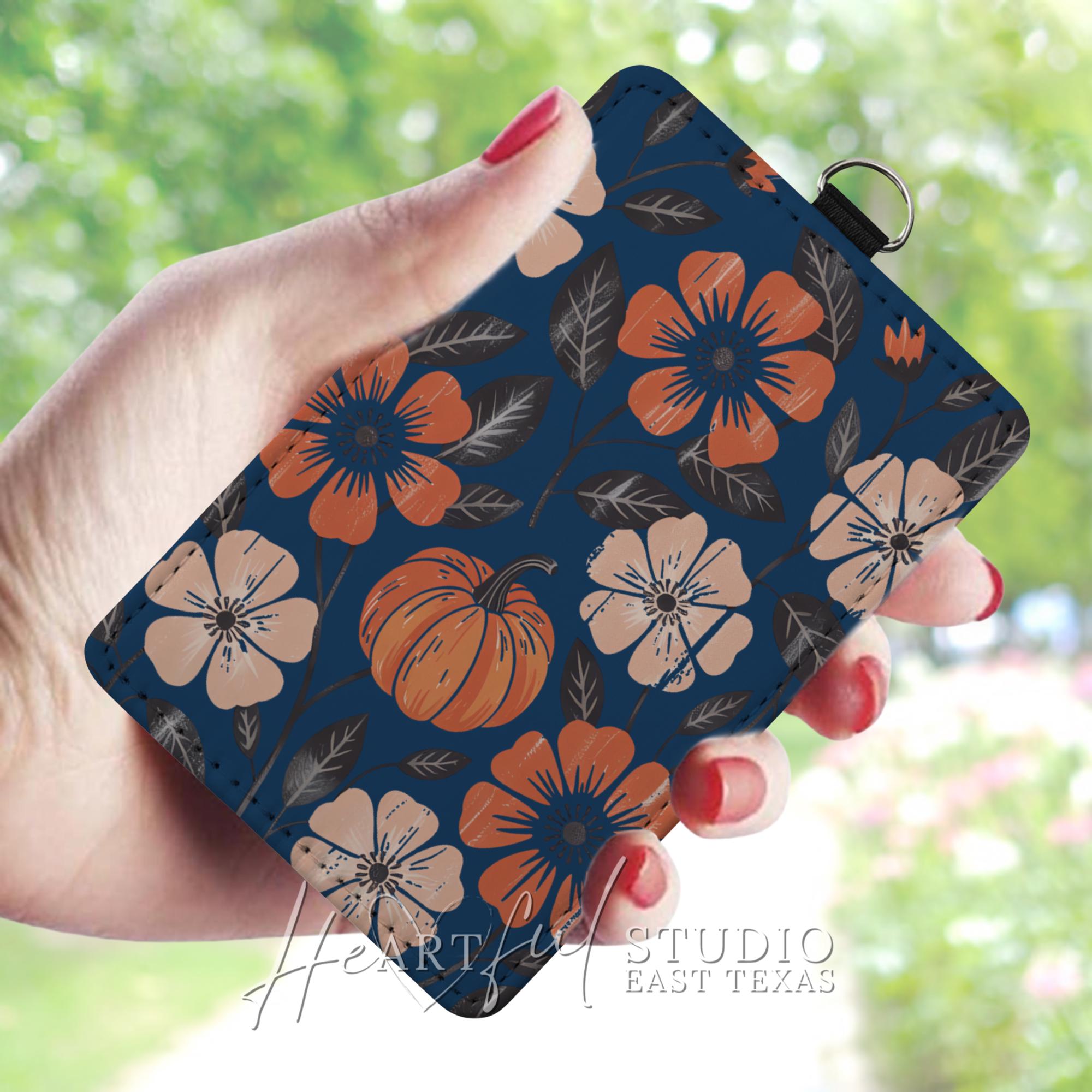 Embrace the cozy vibes of autumn with this navy-blue Fall Pumpkin Card Wallet. The eye-catching fall-themed design will elevate your everyday carry while the convenient card slots and optional keychain or wristlet strap makes it a must-have for busy on-the-go lifestyles. Personalize it with your name or initials to add a touch of personal flair. Upgrade your daily routine and showcase your autumn aesthetic with this stylish and functional card wallet.