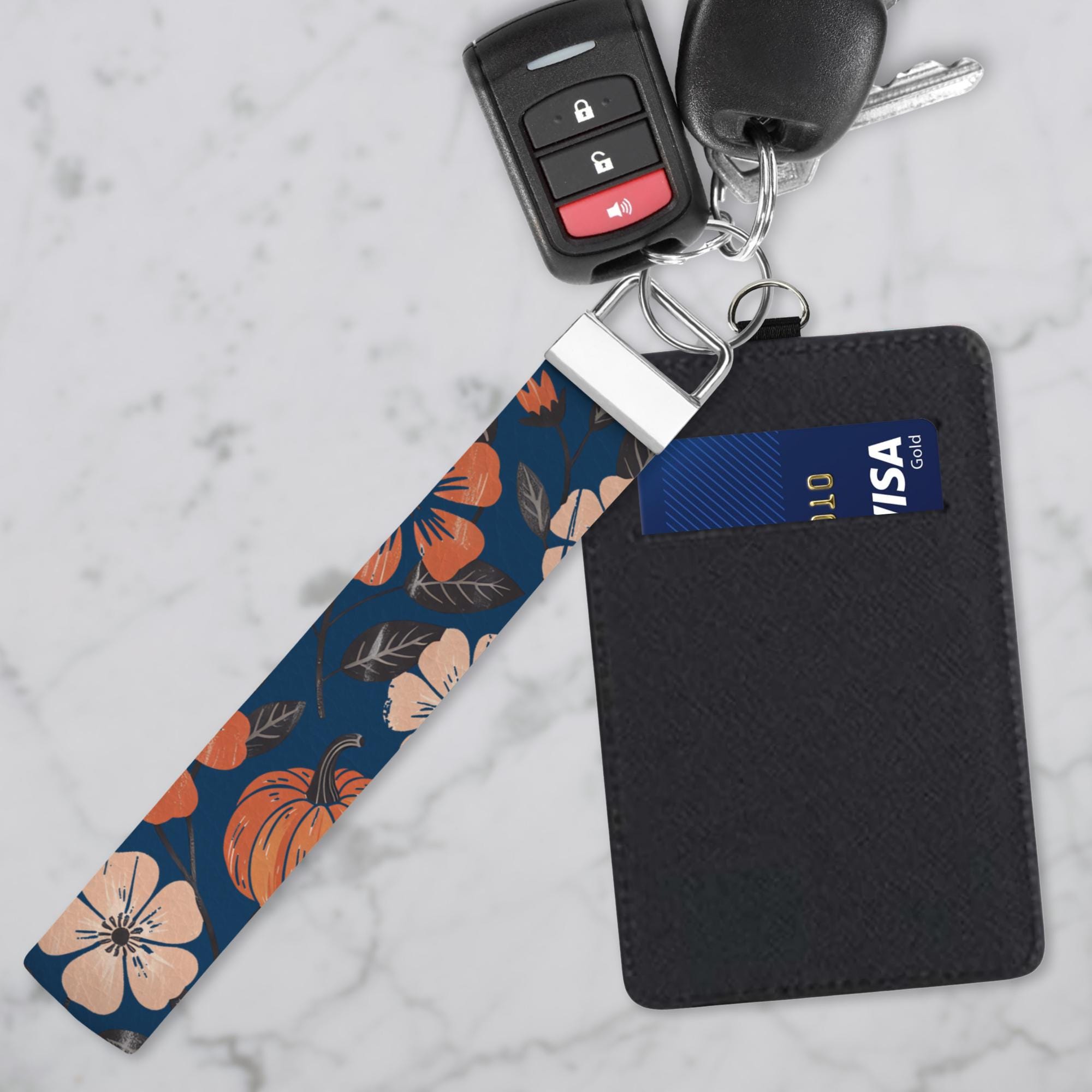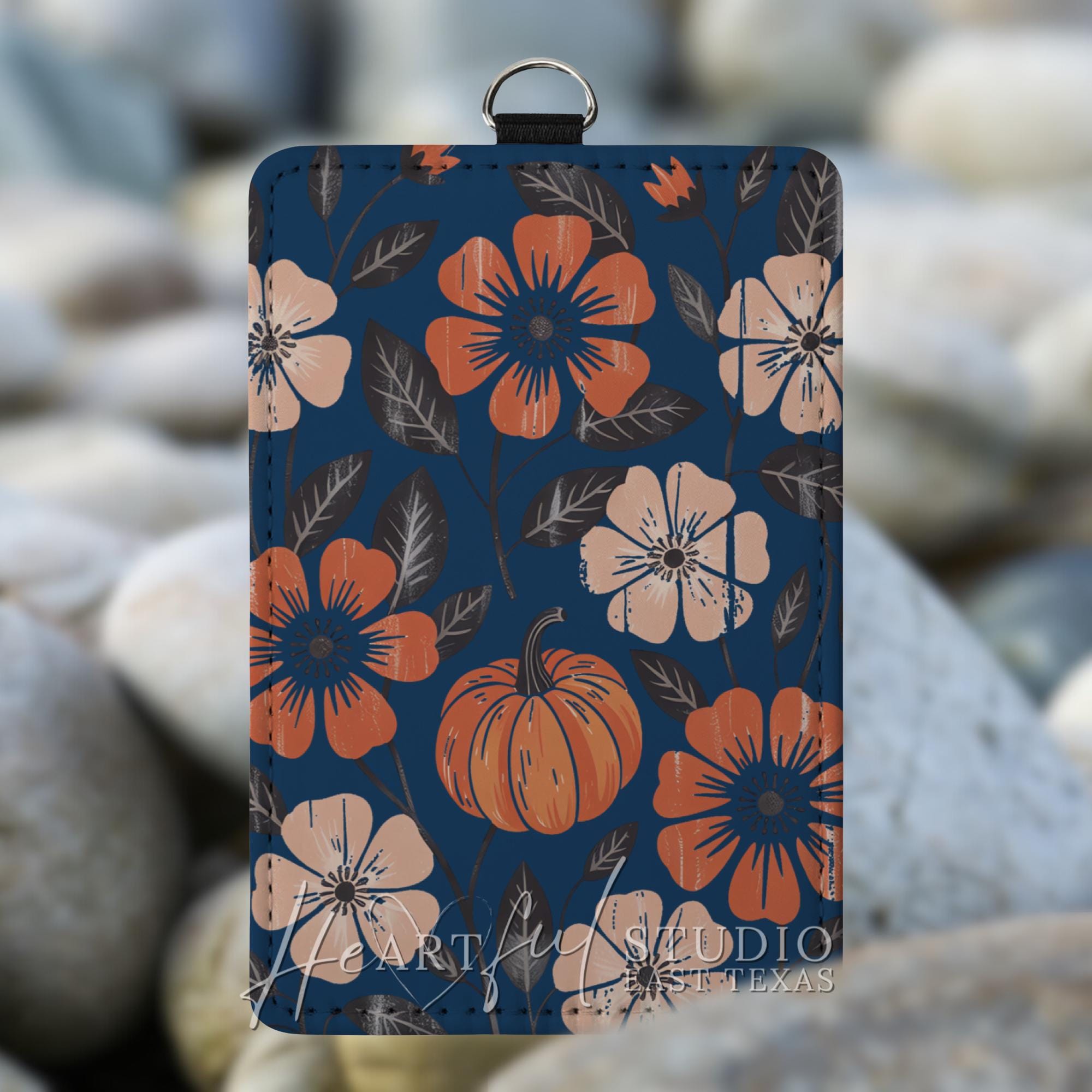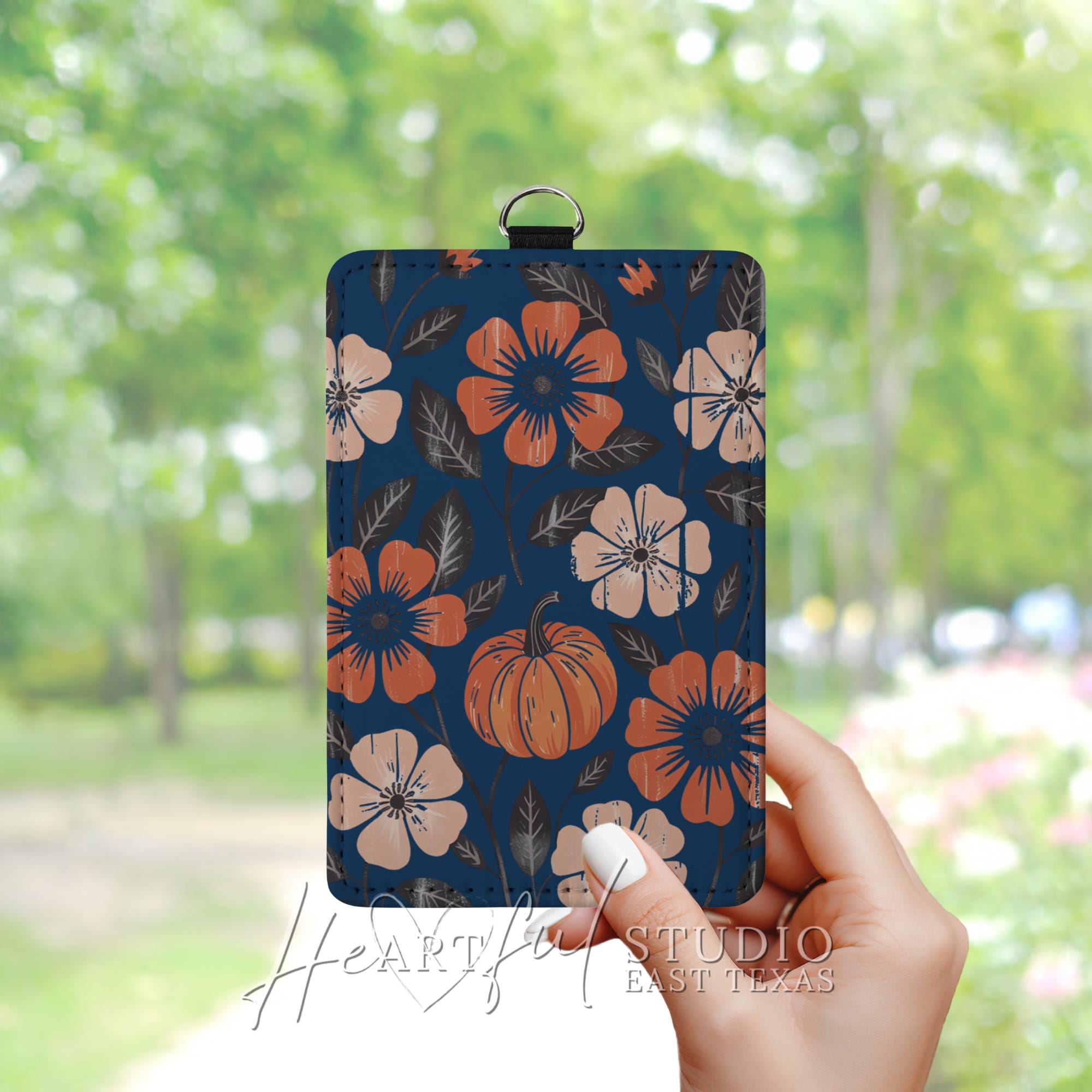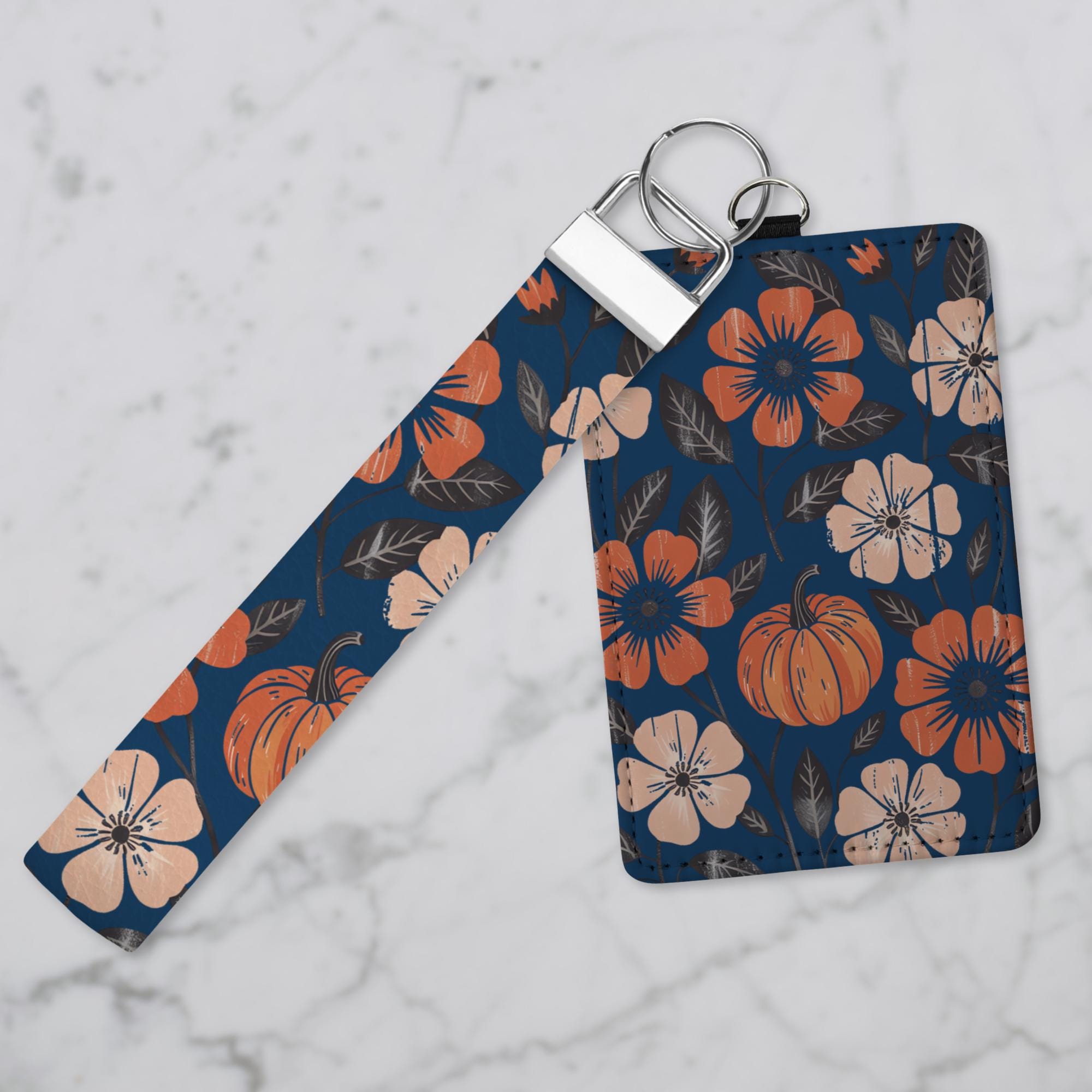 Embrace the cozy vibes of autumn with this navy-blue Fall Pumpkin Card Wallet. The eye-catching fall-themed design will elevate your everyday carry while the convenient card slots and optional keychain or wristlet strap makes it a must-have for busy on-the-go lifestyles. Personalize it with your name or initials to add a touch of personal flair. Upgrade your daily routine and showcase your autumn aesthetic with this stylish and functional card wallet.