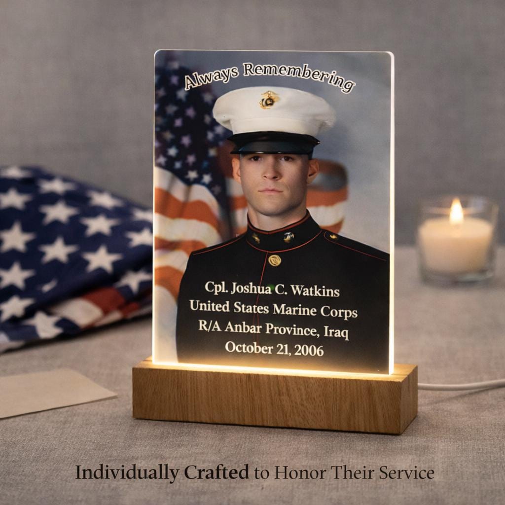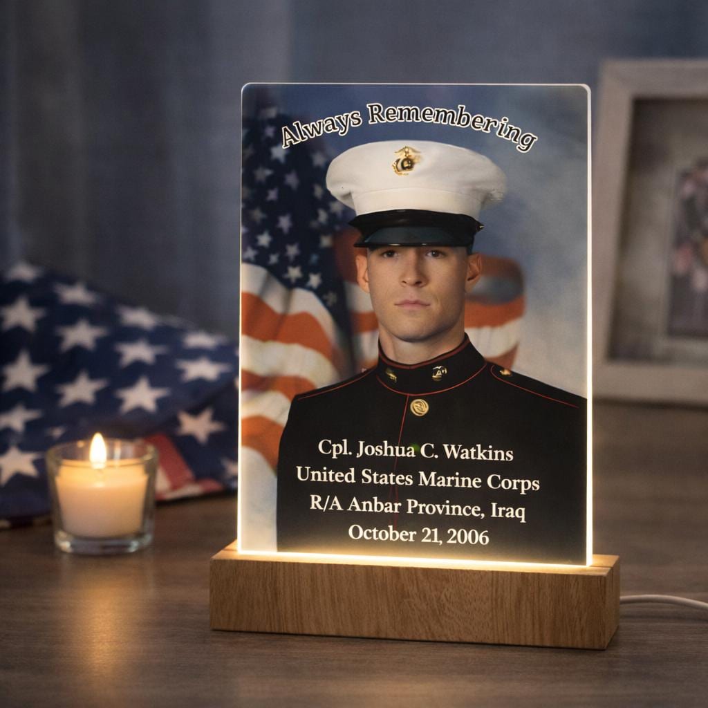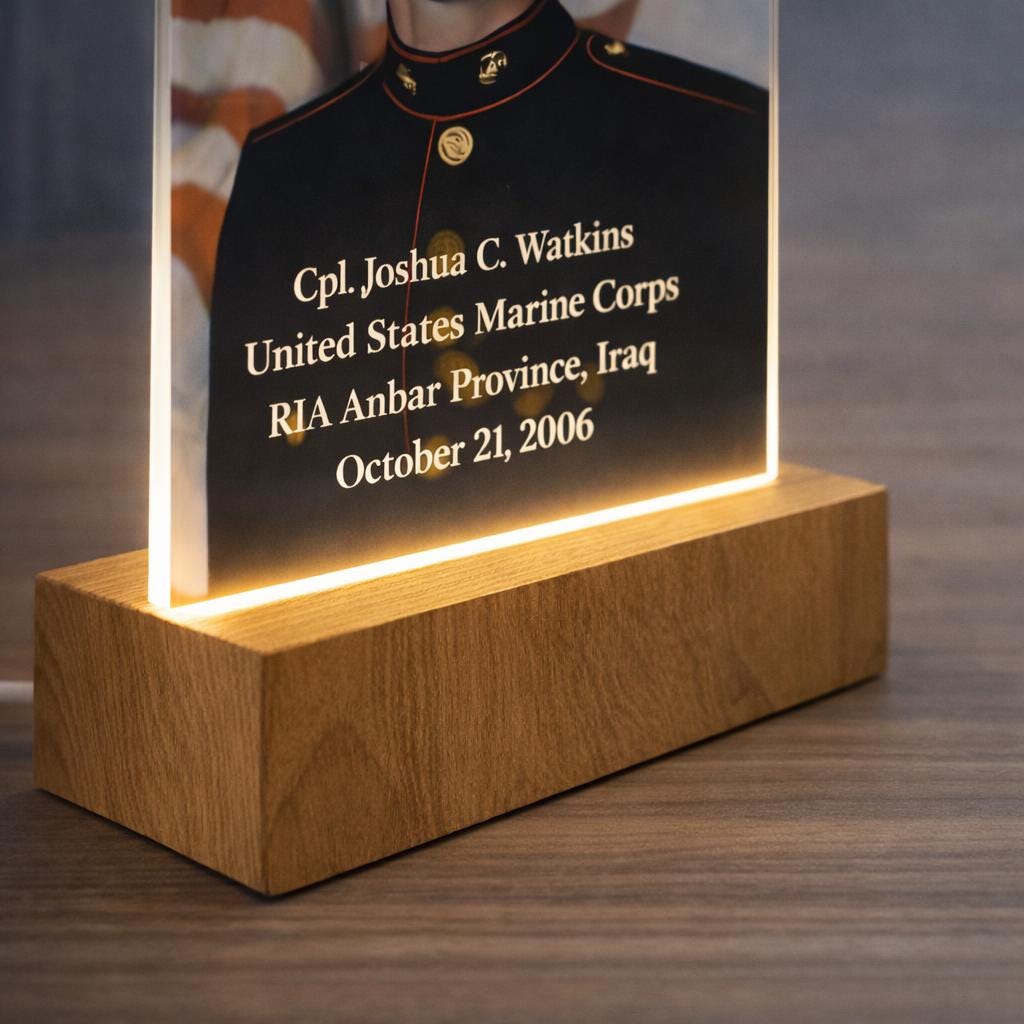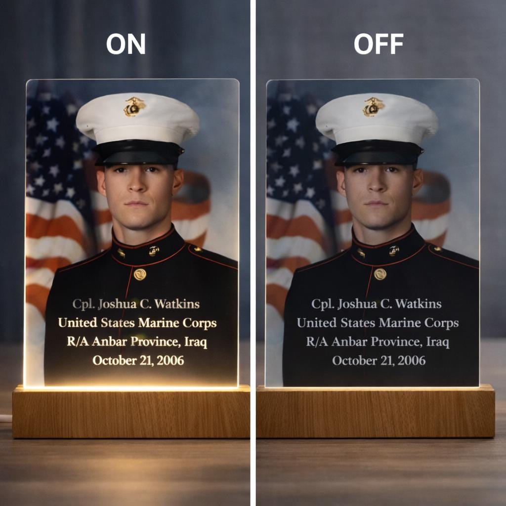 This custom 8” x 6” acrylic memorial light is a timeless tribute to a fallen hero, designed to preserve their image, service, and sacrifice with dignity and respect. Soft LED illumination brings the portrait to life, creating a comforting presence — day or night — for those who continue to remember.