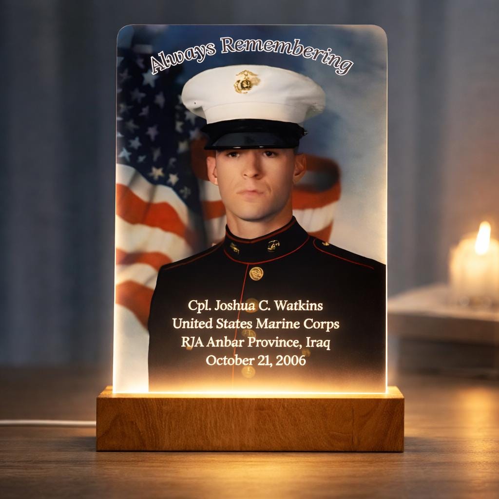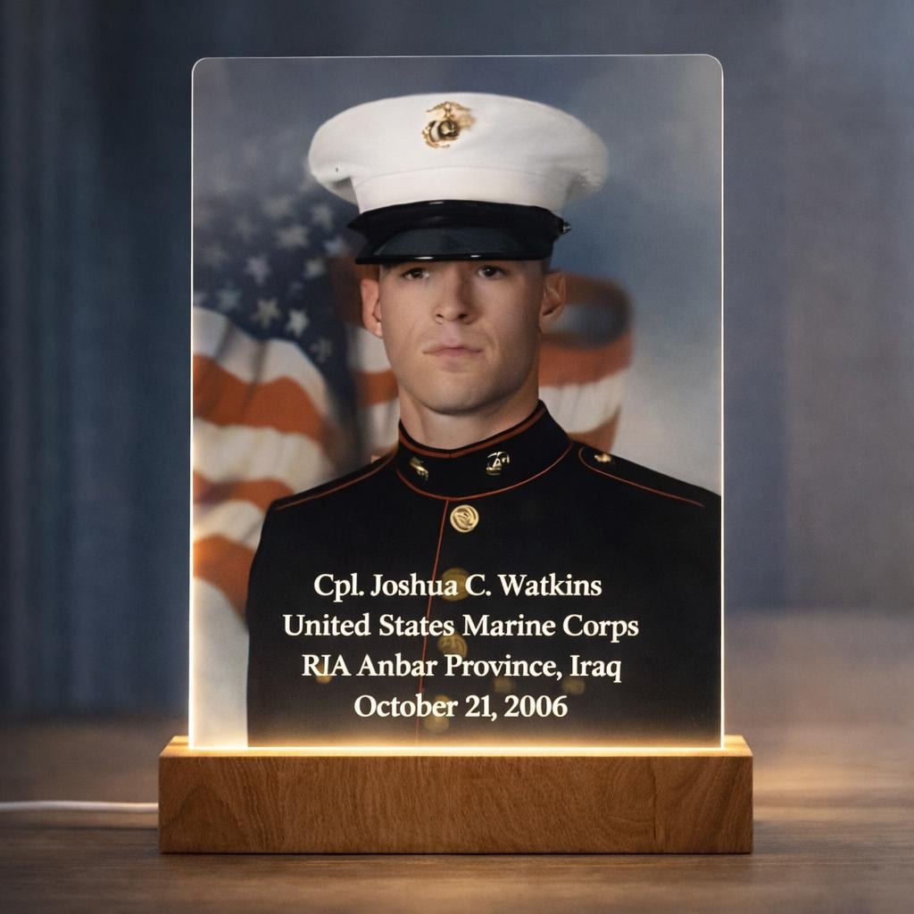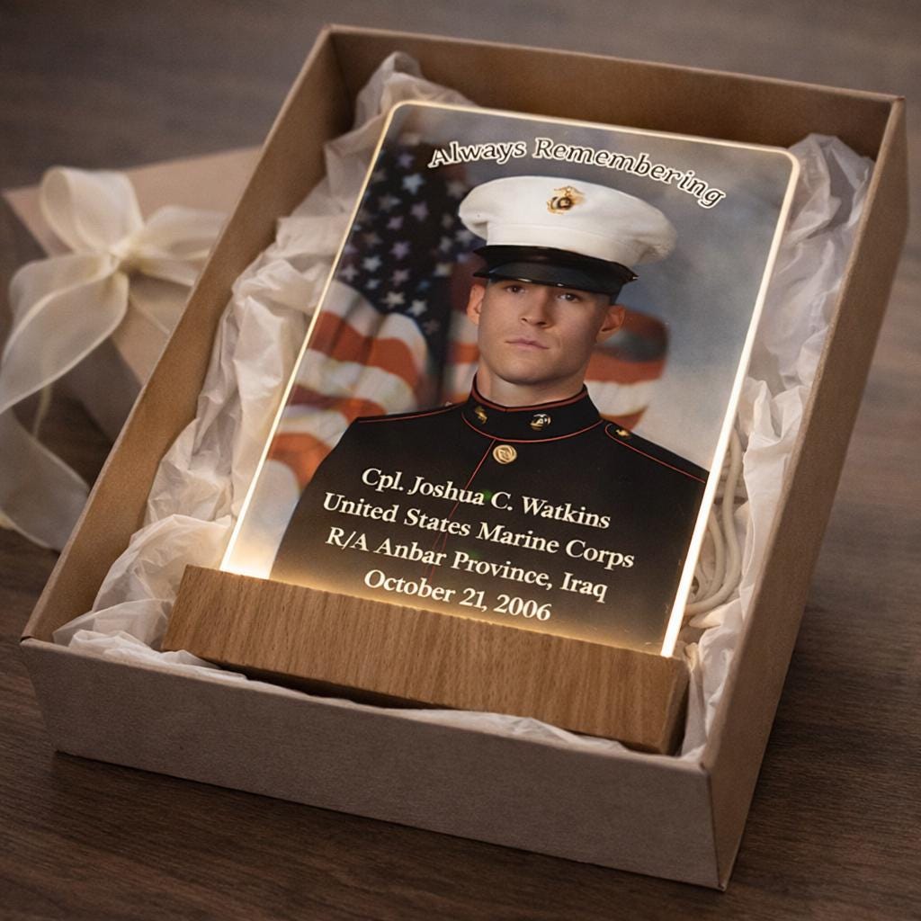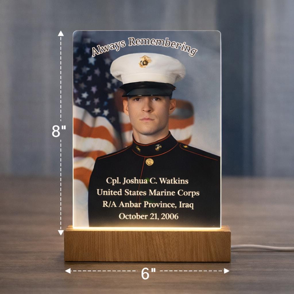 This custom 8” x 6” acrylic memorial light is a timeless tribute to a fallen hero, designed to preserve their image, service, and sacrifice with dignity and respect. Soft LED illumination brings the portrait to life, creating a comforting presence — day or night — for those who continue to remember.