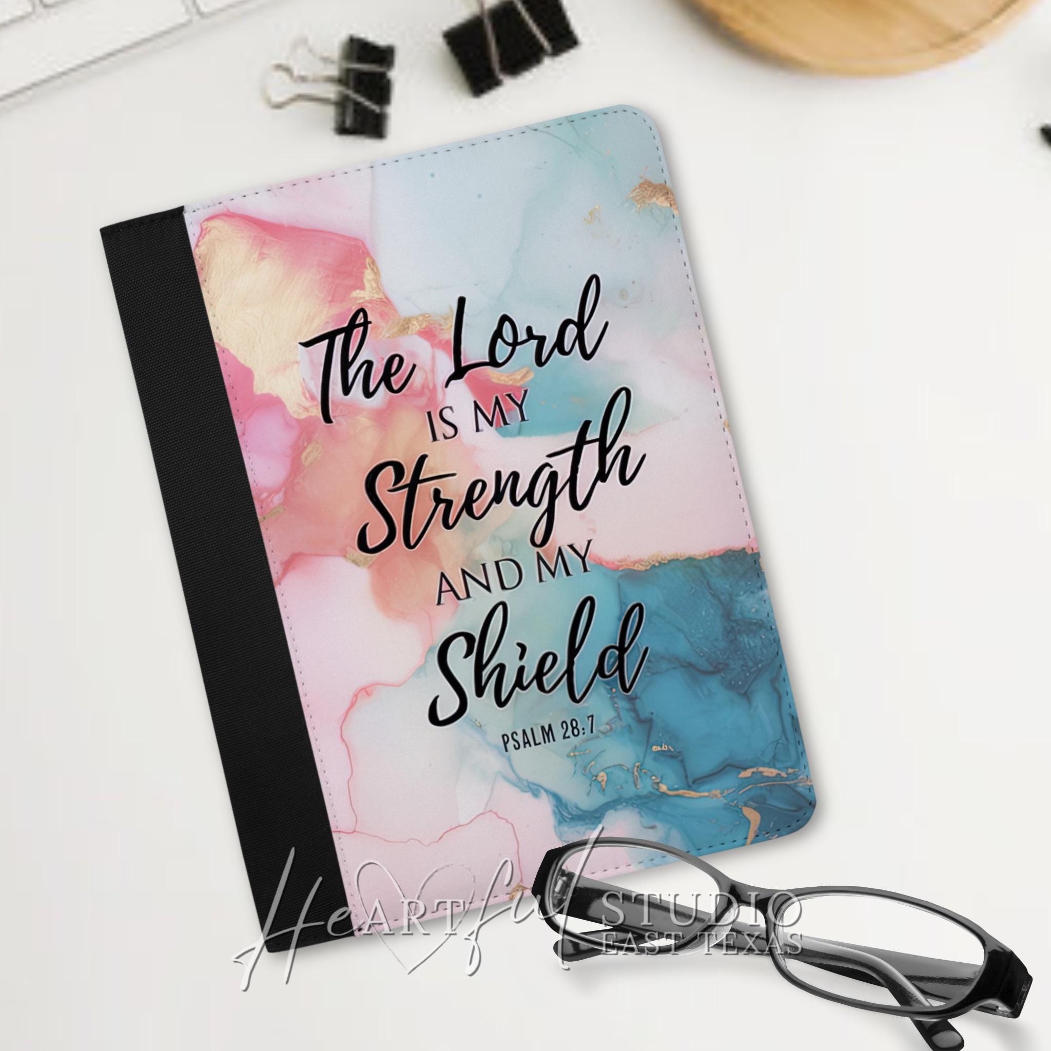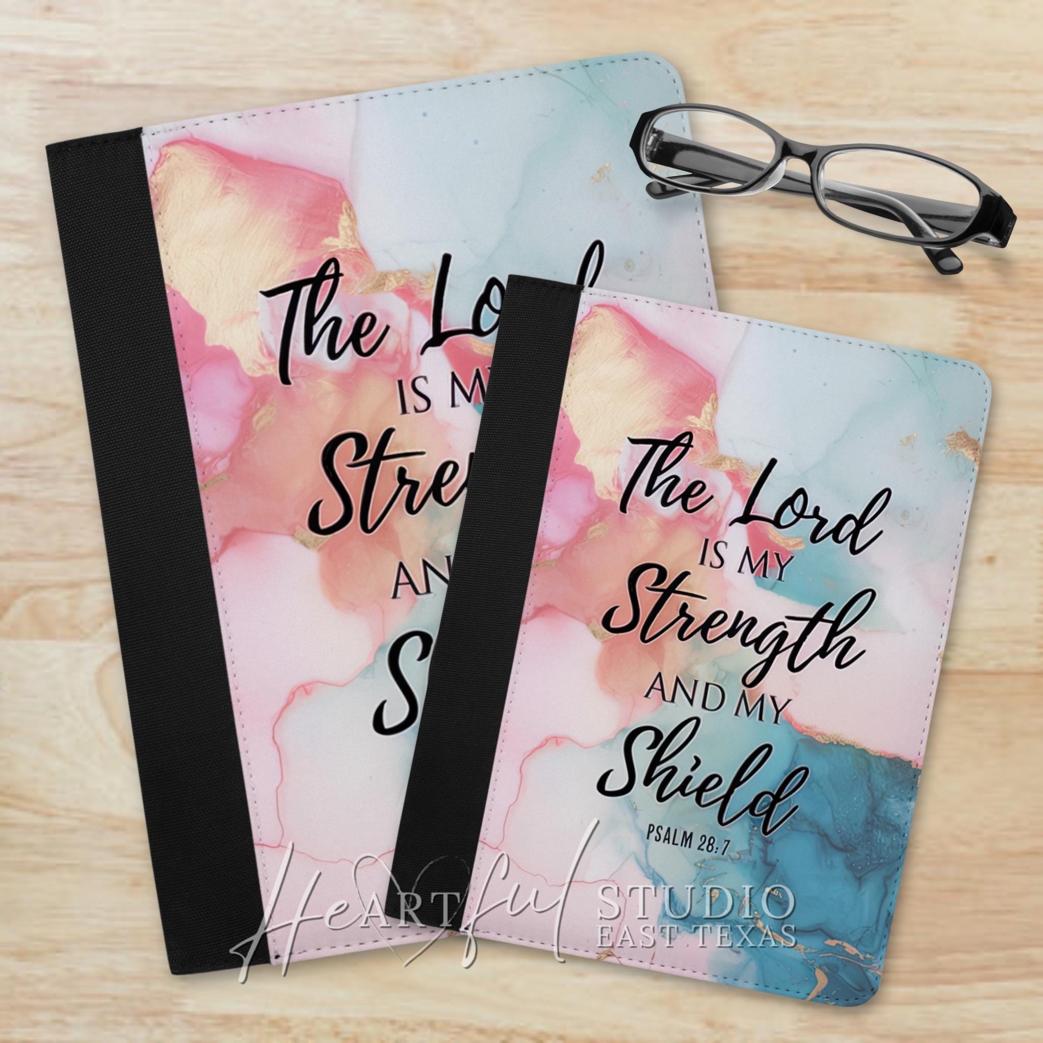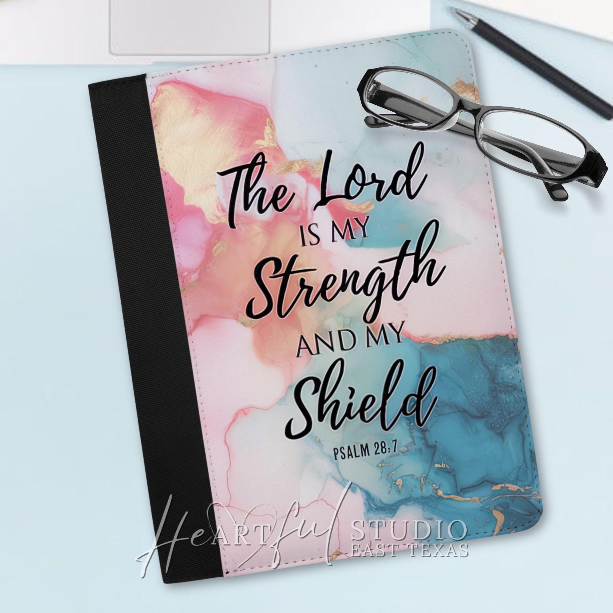 Strengthen your connection to the Lord with every use. This padfolio's inspiring Psalm 28:7 design reminds you that "The Lord is the strength and my shield." Easily store your Bible study notes, and prayer requests in the ample organizational pockets. Whether you're journaling at home or taking your faith on the go, this personalized padfolio will be your constant companion.