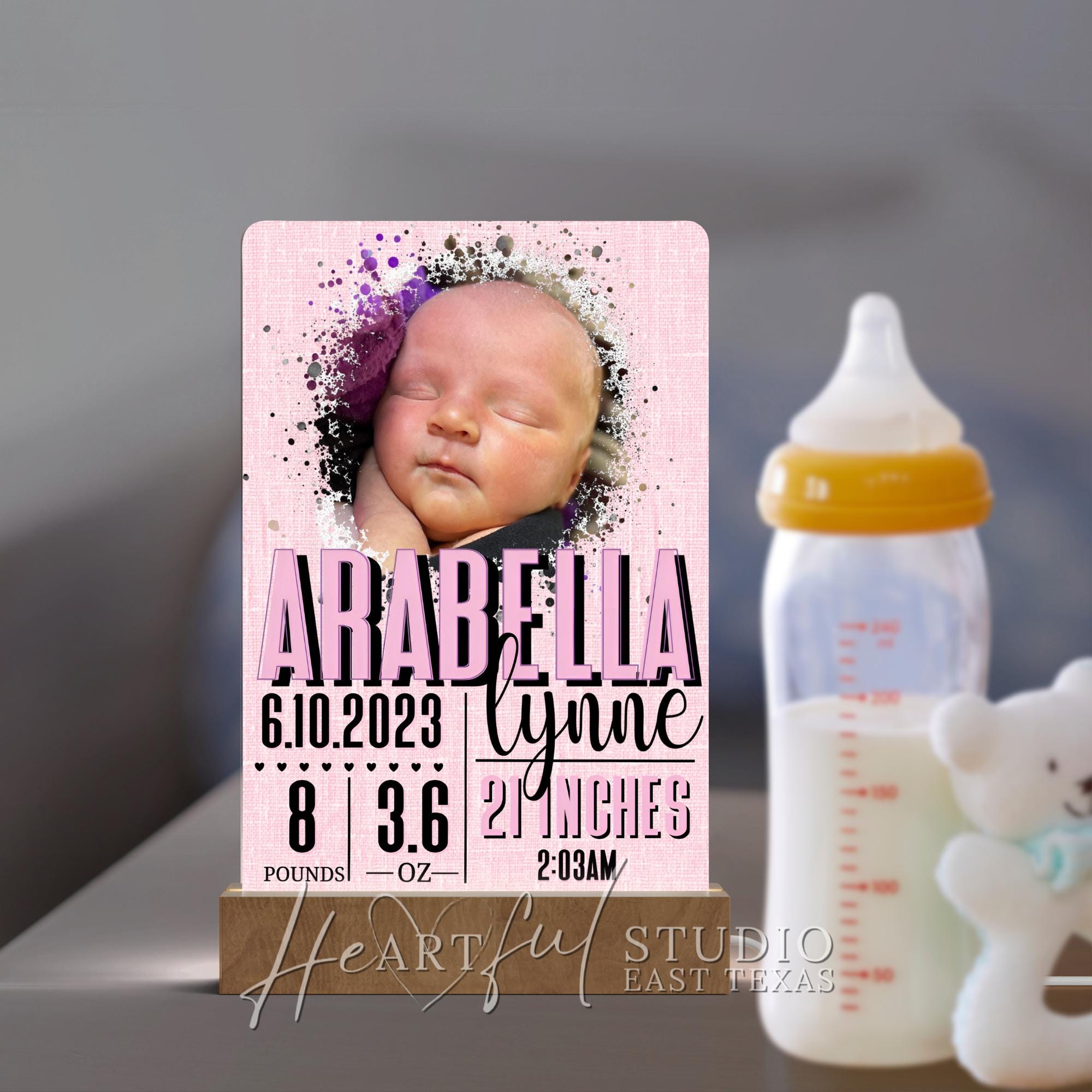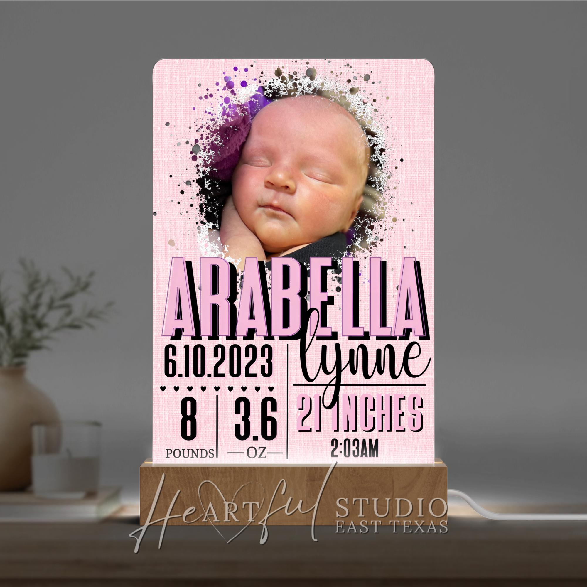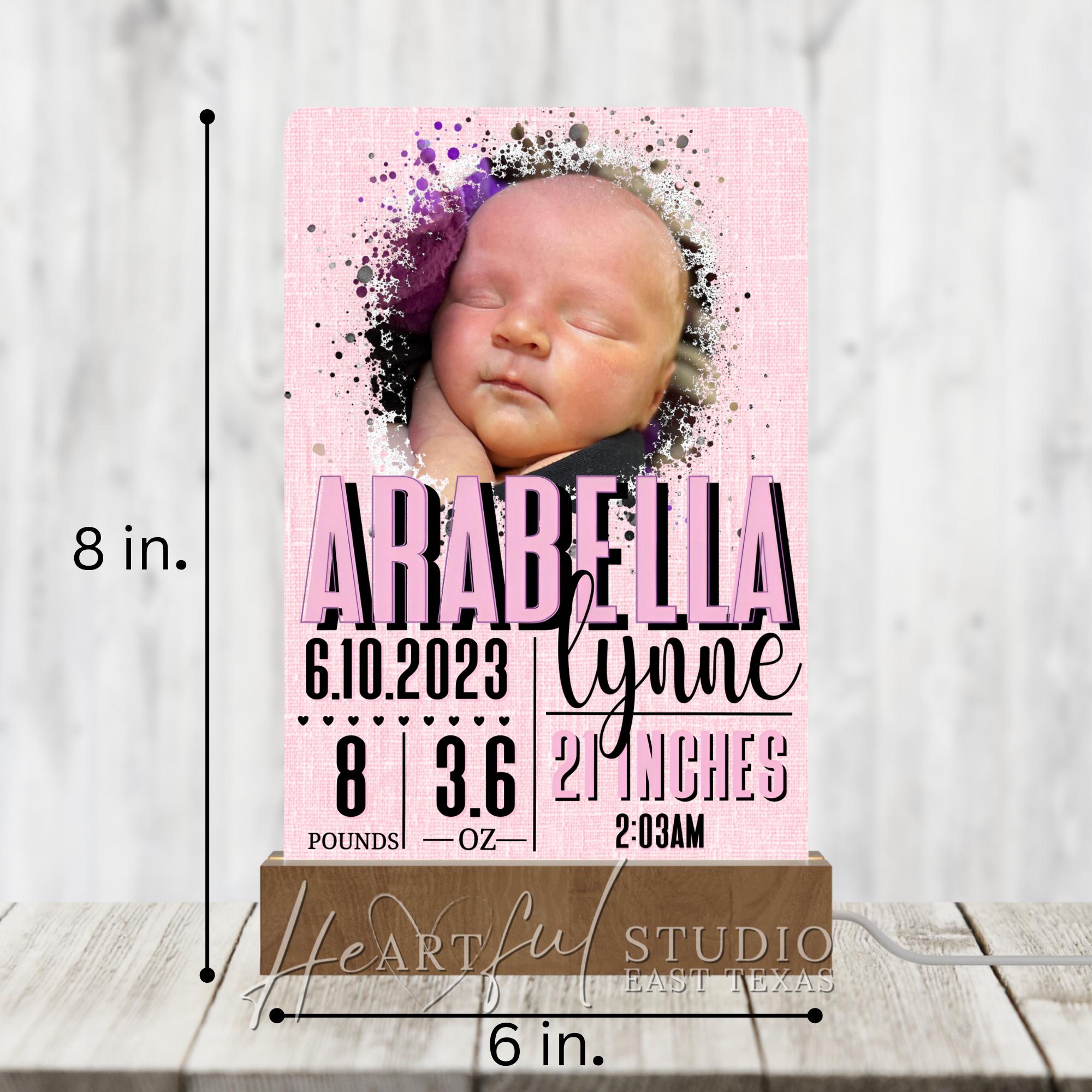 Celebrate your little one's arrival with the perfect personalized keepsake - the Baby Birth Announcement Light Frame. This stunning 6"x8" frame illuminates your newborn's special details in full color, creating a warm, inviting glow that will captivate any nursery.