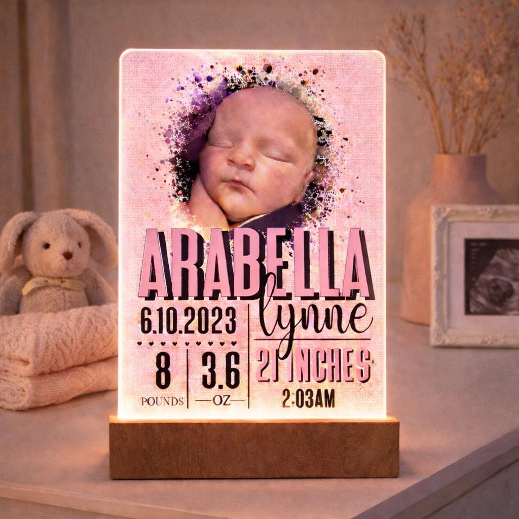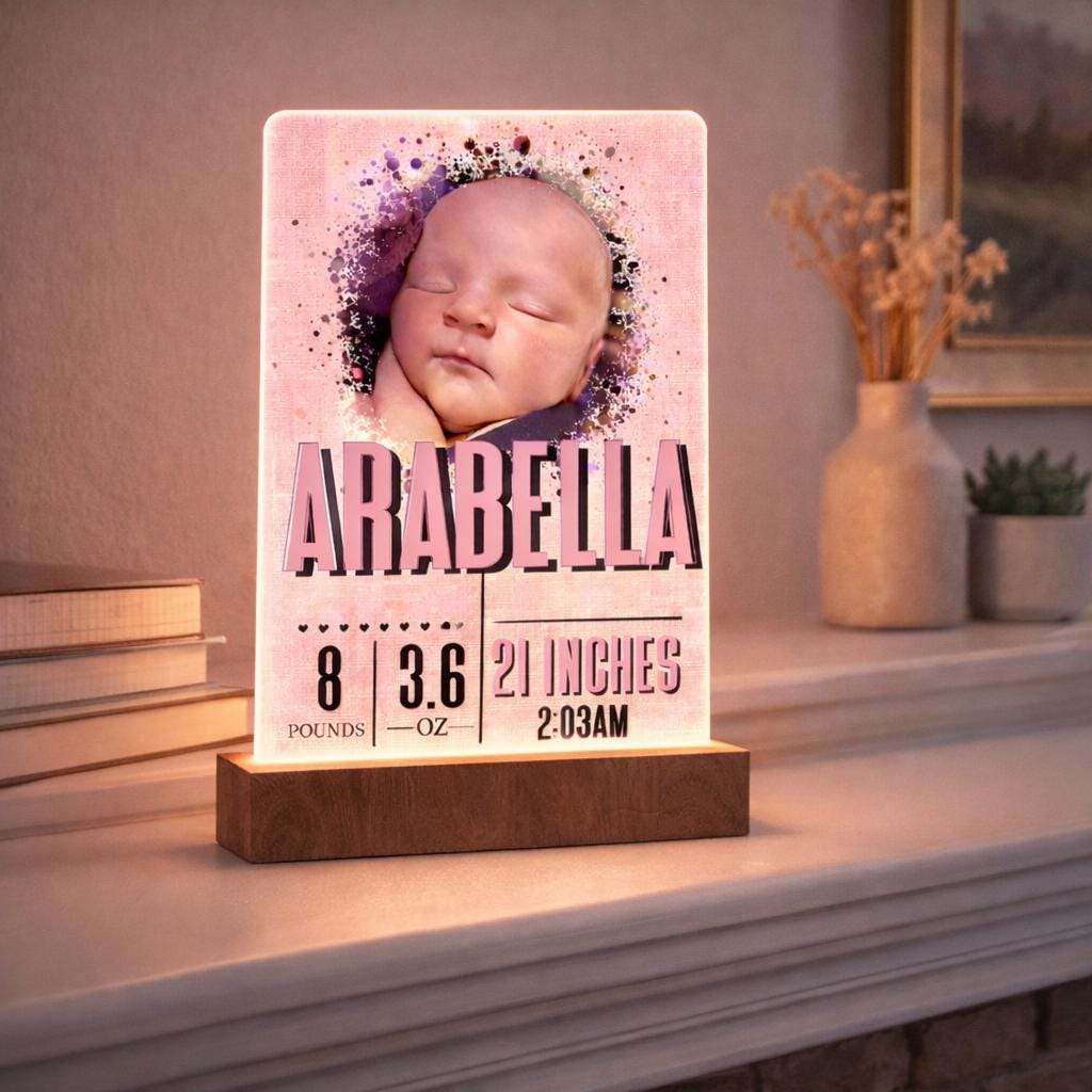 This custom acrylic light features your baby’s photo, name, and birth details, edge-lit from a warm wooden base to create a gentle, comforting glow. Perfect as a newborn announcement, nursery night light, or baby shower gift, each piece is made to honor one of life’s most meaningful milestones.