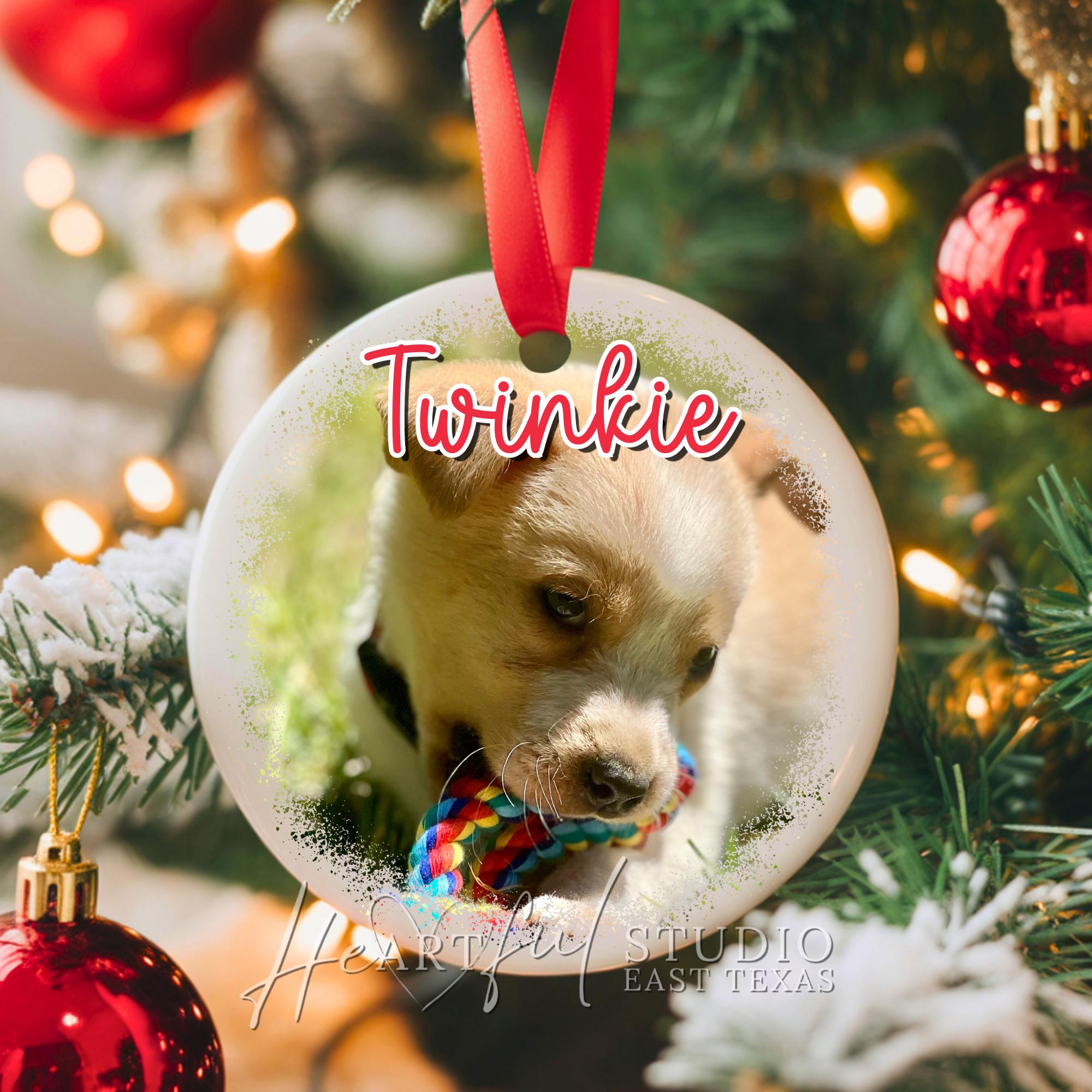 Commemorate your furry best friend with this stunning Custom Photo Pet Ornament. Featuring a vibrant, glossy print of your beloved pet, this personalized ceramic ornament is a heartfelt keepsake that will bring joy every time you hang it on your tree.