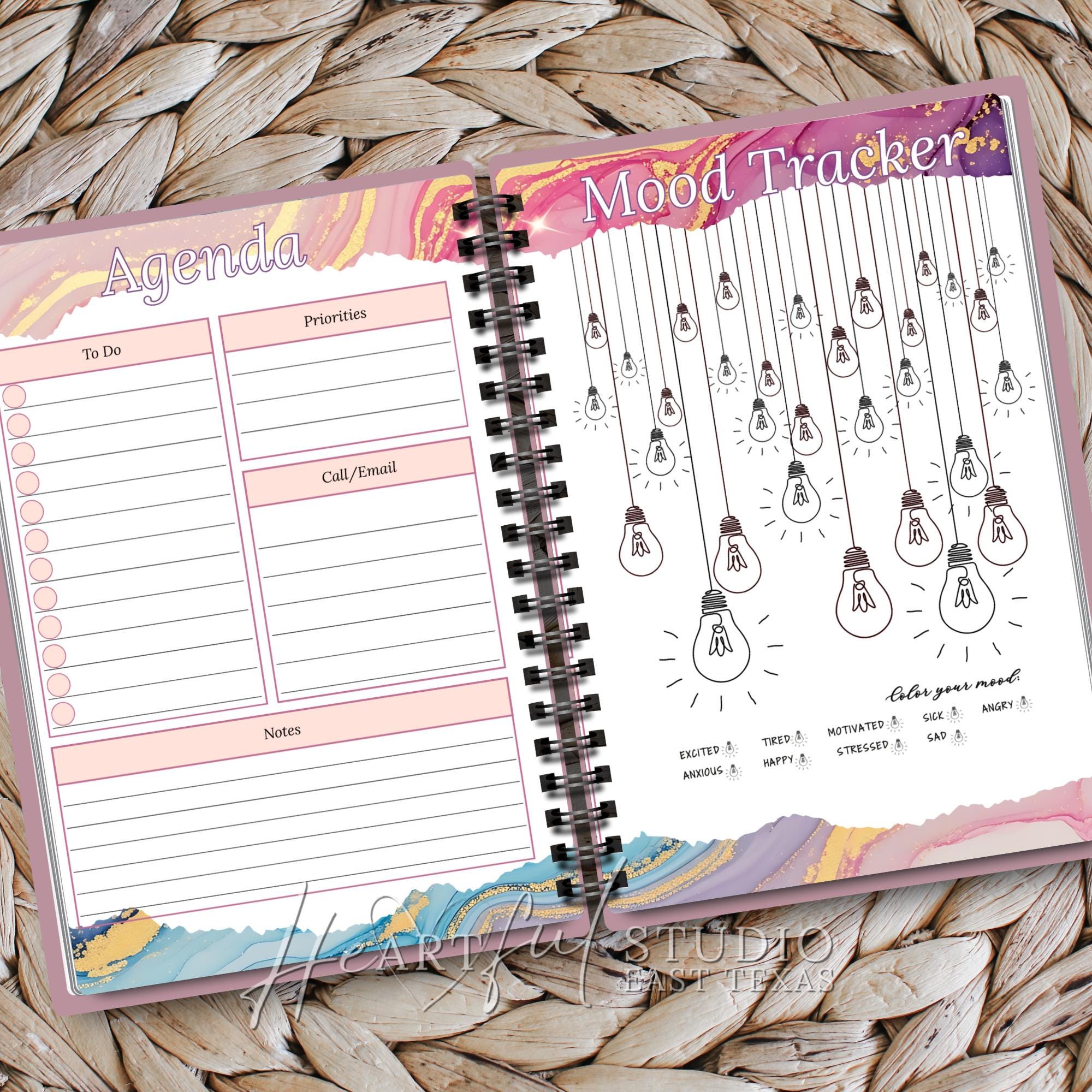 • Mood trackers, agenda and journal pages