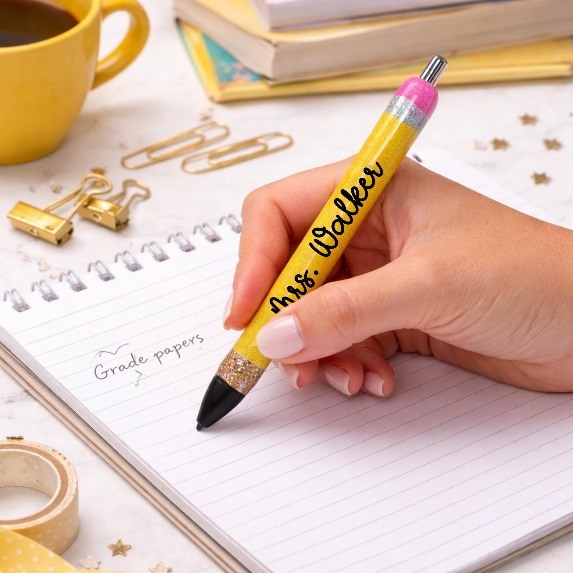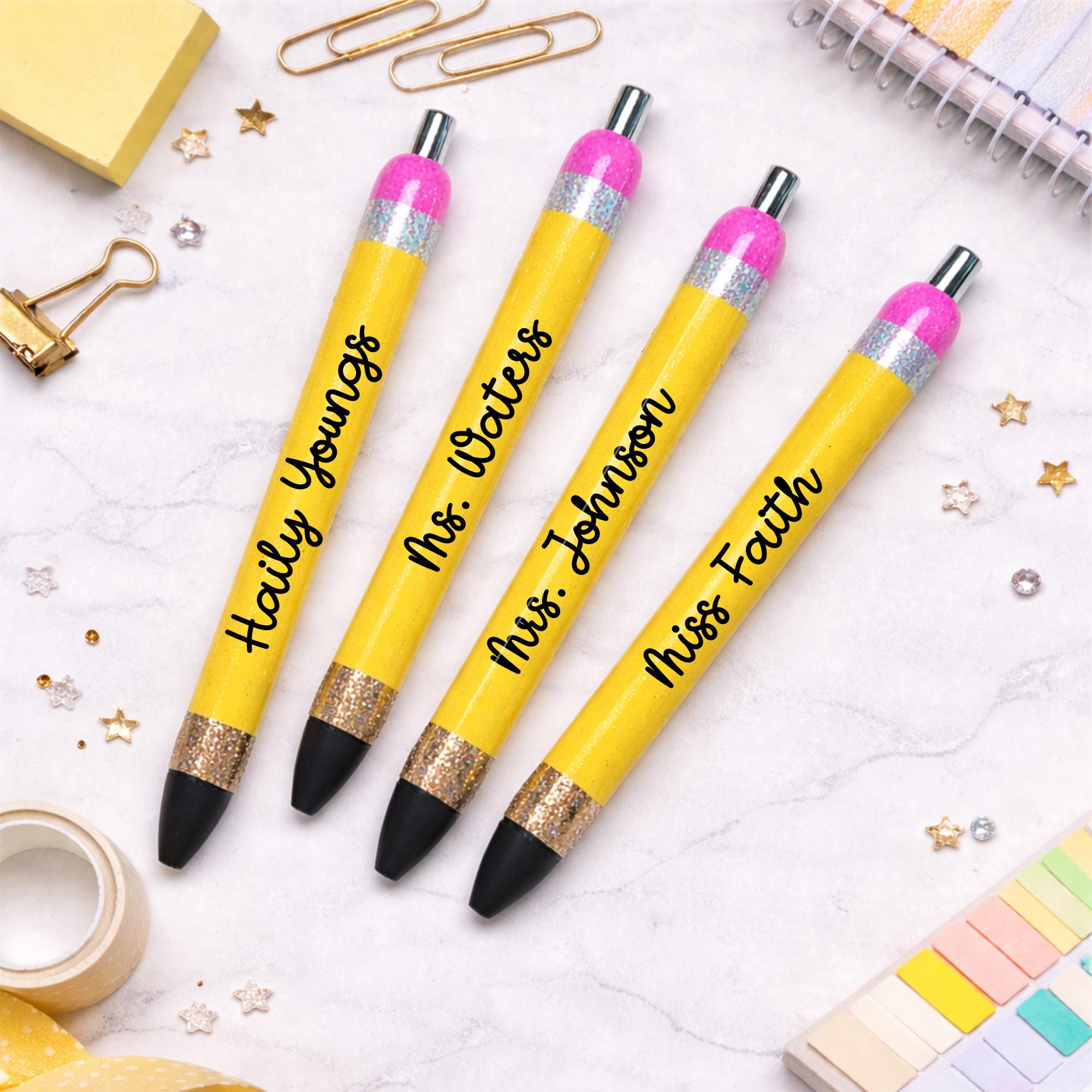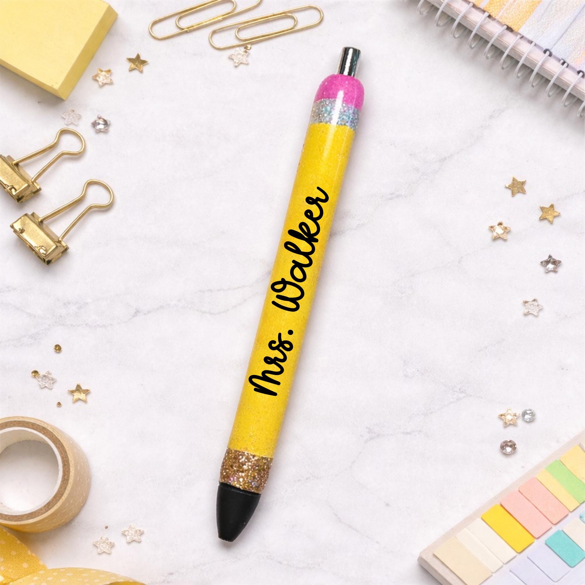 Each pen is carefully handcrafted and customized with the name of your choice, making it a fun and thoughtful gift for teachers, coworkers, students, planners lovers, and anyone who loves a little sparkle.