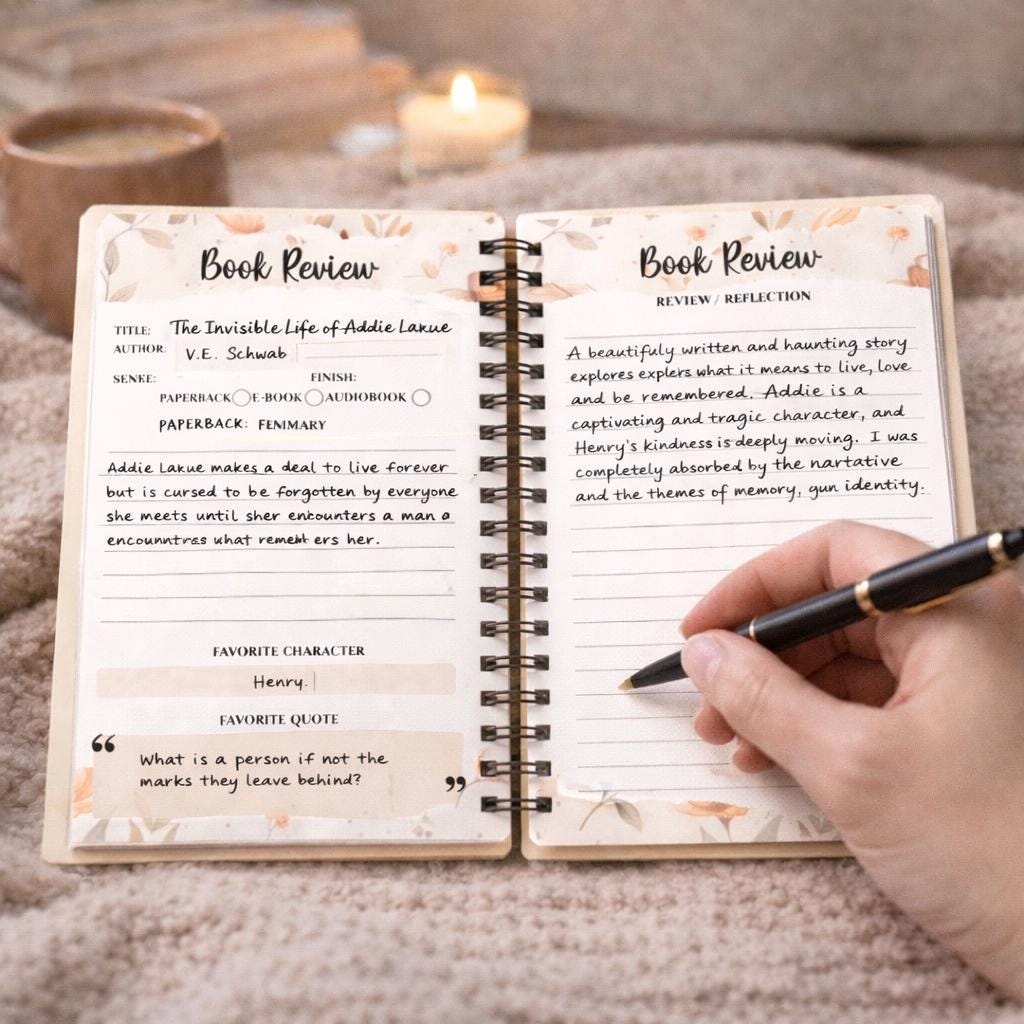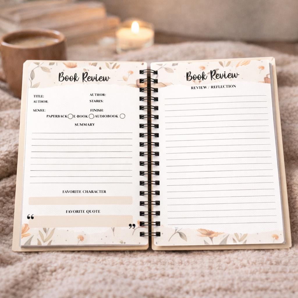 📝 Each Book Review Spread Includes