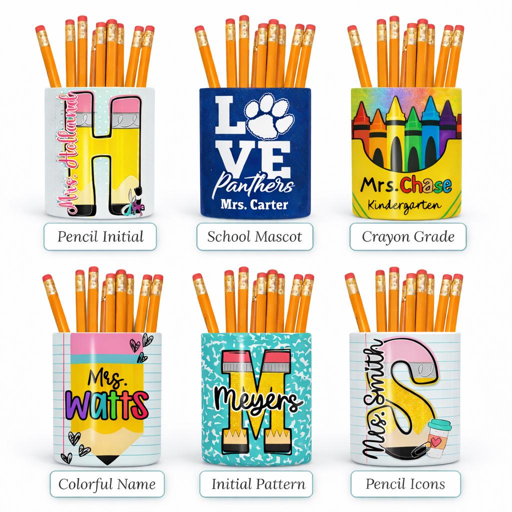 Pencil holder designs are professionally applied and made for long-lasting classroom use.