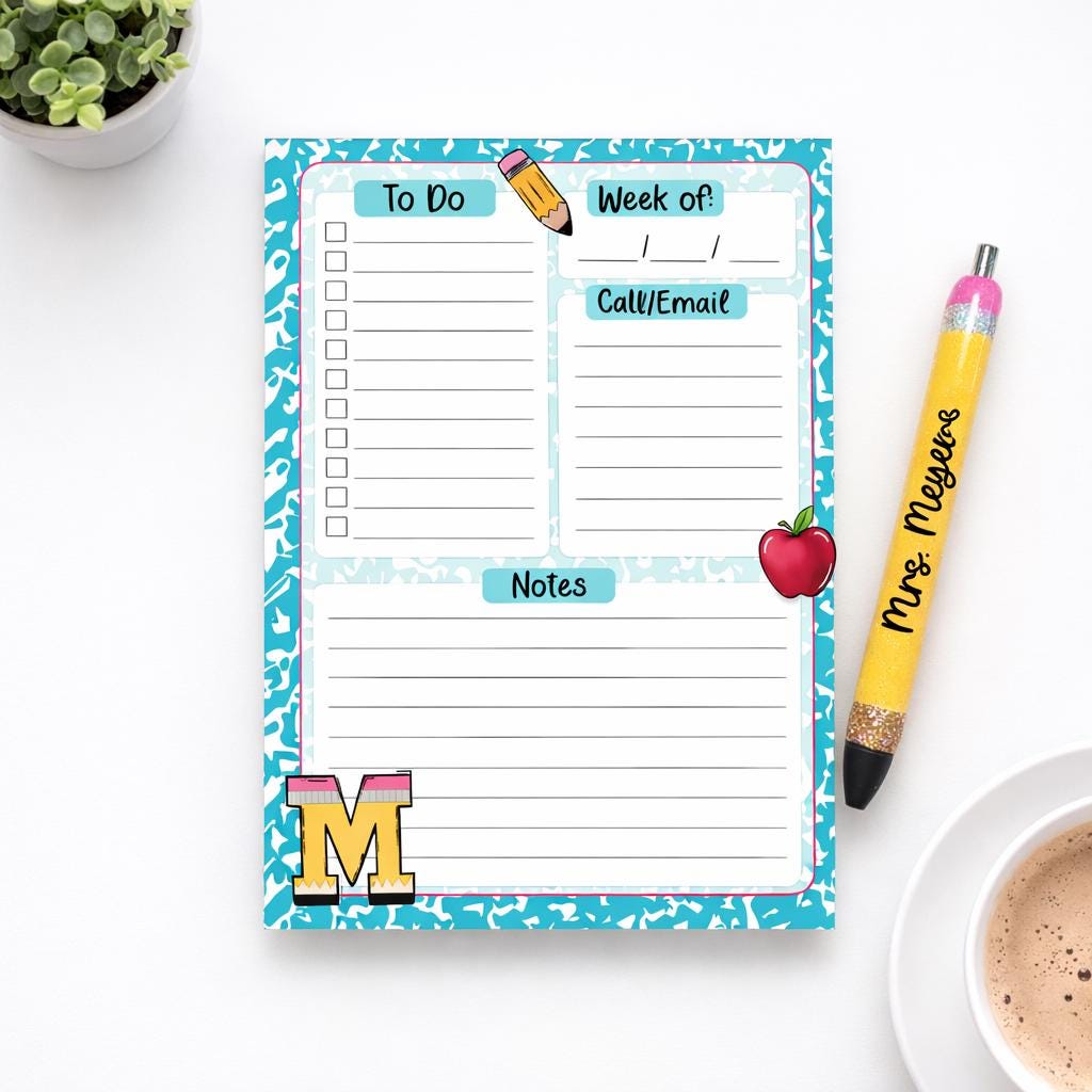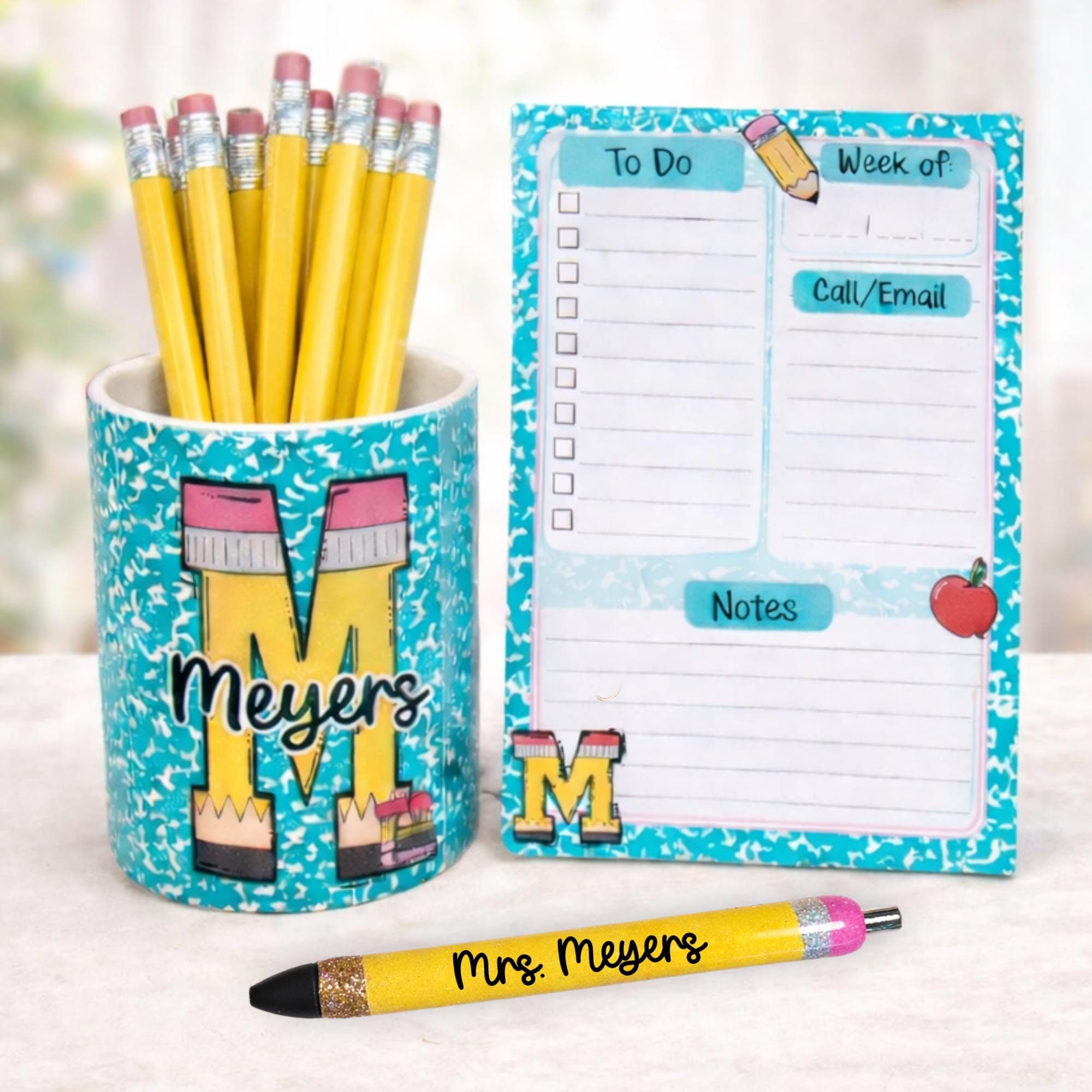 Make a teacher’s desk extra special with this personalized teacher desk set featuring a custom pencil holder mug, matching teacher notepad, and handmade glitter epoxy pen. This coordinated teacher gift set is perfect for teacher appreciation, back to school, end of year gifts, or classroom decor.
